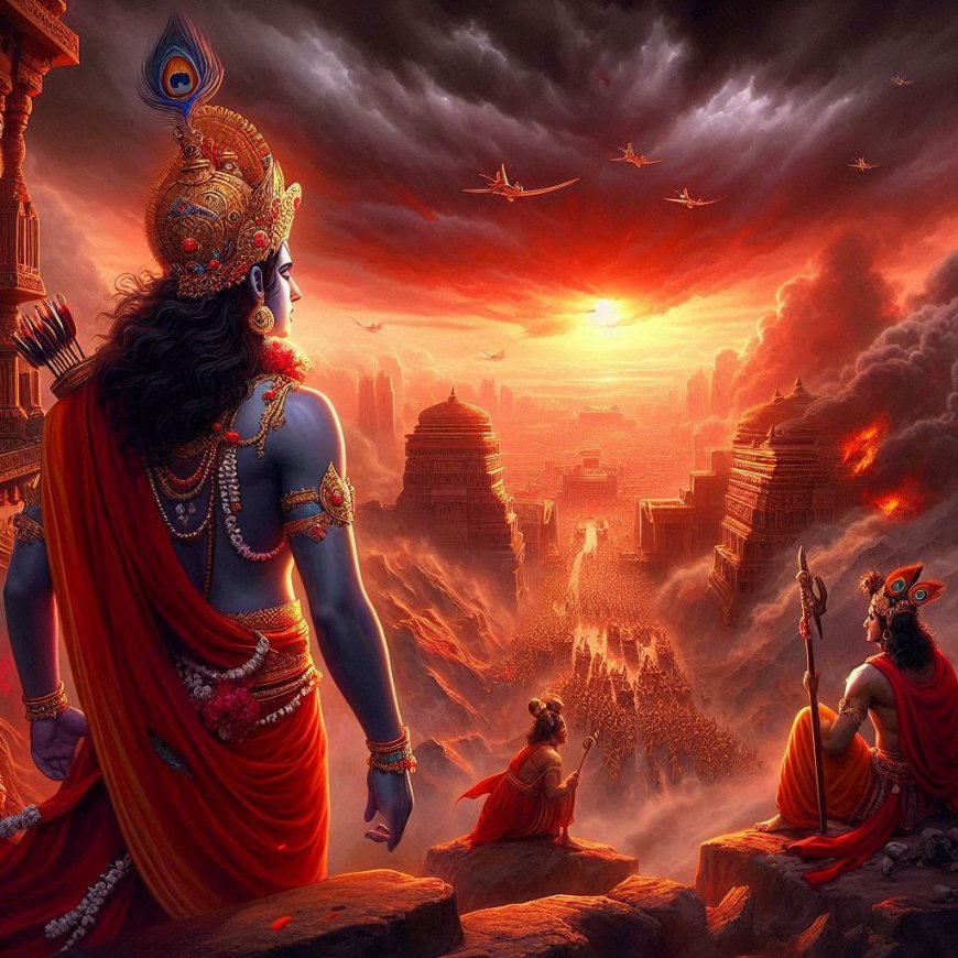 Krishna, who knew from the beginning that the destruction of the Yadavas was the result of the curse of the sages, could only watch with a heavy and sorrowful heart. Despite his immense power and profound wisdom, Krishna was hindered by the force of a predetermined and unchangeable destiny. In an attempt to halt the chaos, Krishna tried hard to calm the violence and pacify those involved, but all his efforts seemed futile in the face of the irresistible current. The excruciating and heartbreaking destruction of the Yadavas was part of a plan that could not be avoided or changed. With deep regret, Krishna watched the annihilation of his once beloved tribe as part of a larger and inevitable cosmic cycle.