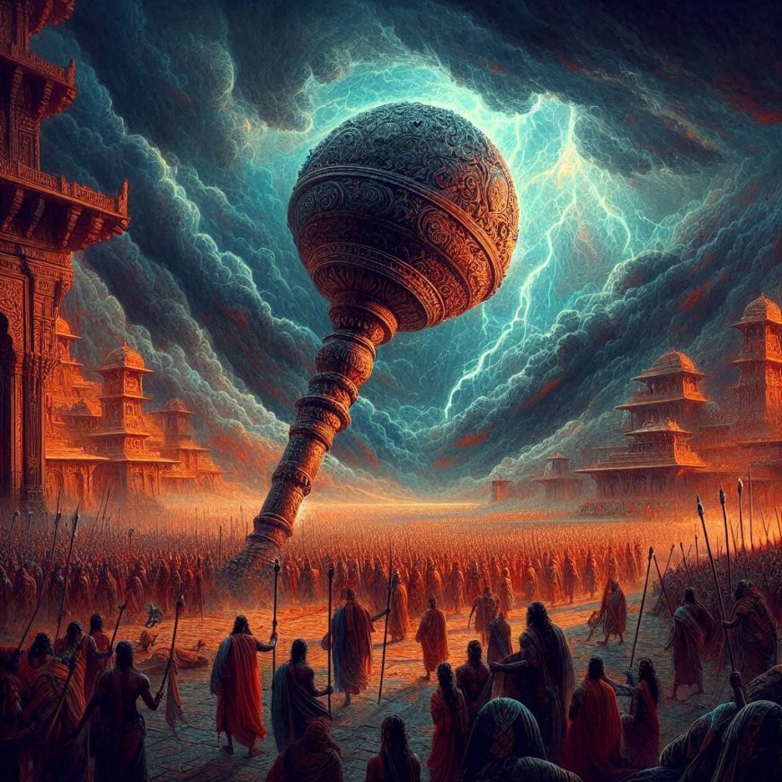 Feeling mocked and insulted, the holy rishis became furious. One of them uttered a terrible curse: The "child" that Samba would give birth to would not be a baby, but an iron mace (mausala) that would be the cause of the destruction of the entire Yadava tribe. This curse immediately caused fear and anxiety among the Yadava tribe members who heard it. However, many Yadavas downplayed the threat and dismissed it as meaningless words. Only a few realized that the curse of these holy rishis was not something to be ignored and that the tragic fate written in the curse would soon change their lives forever.