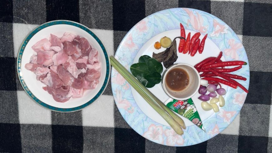 Blend garlic, shallots, red chilies, bird’s eye chilies, ginger, and turmeric into a smooth paste. This fine paste is crucial for ensuring the flavors penetrate deeply into the pork.