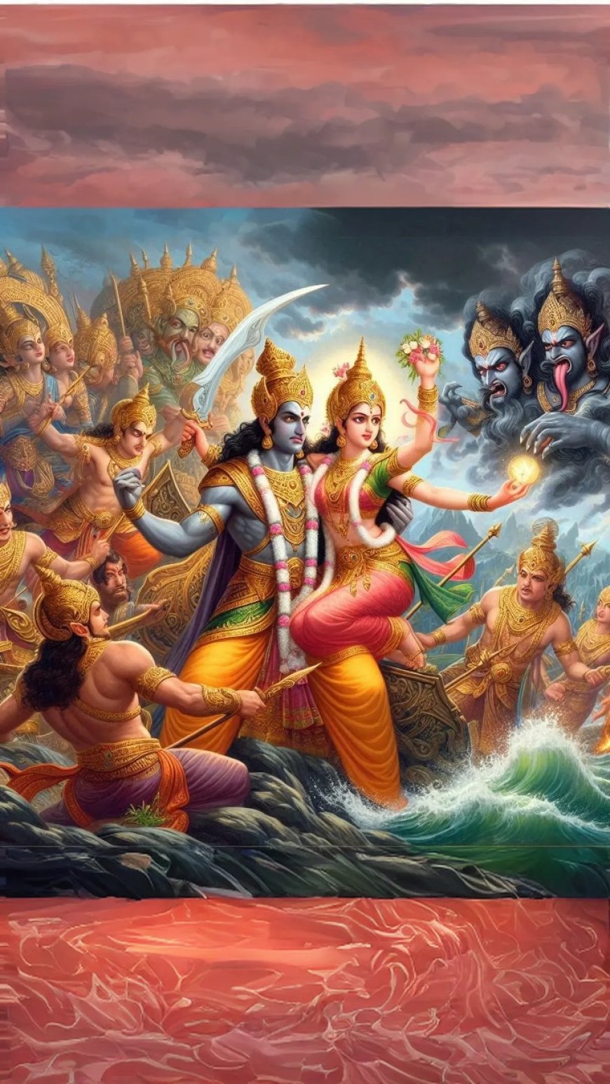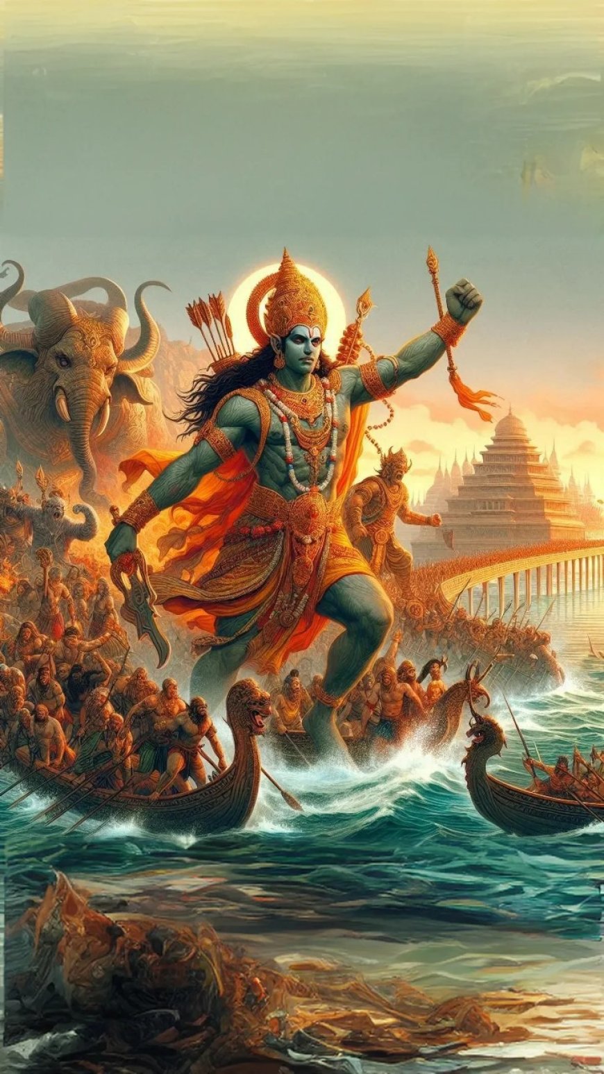 Rama led a vast army of magical beings, humans, and even ancient deities, crossing the sea of fire with the help of Hanuman and a bridge built by his forces. The battle between Rama and Rahwana became a widely known legend, where strength and magic clashed. Rama, with courage and masterful swordsmanship, finally defeated Rahwana after a long and exhausting fight.