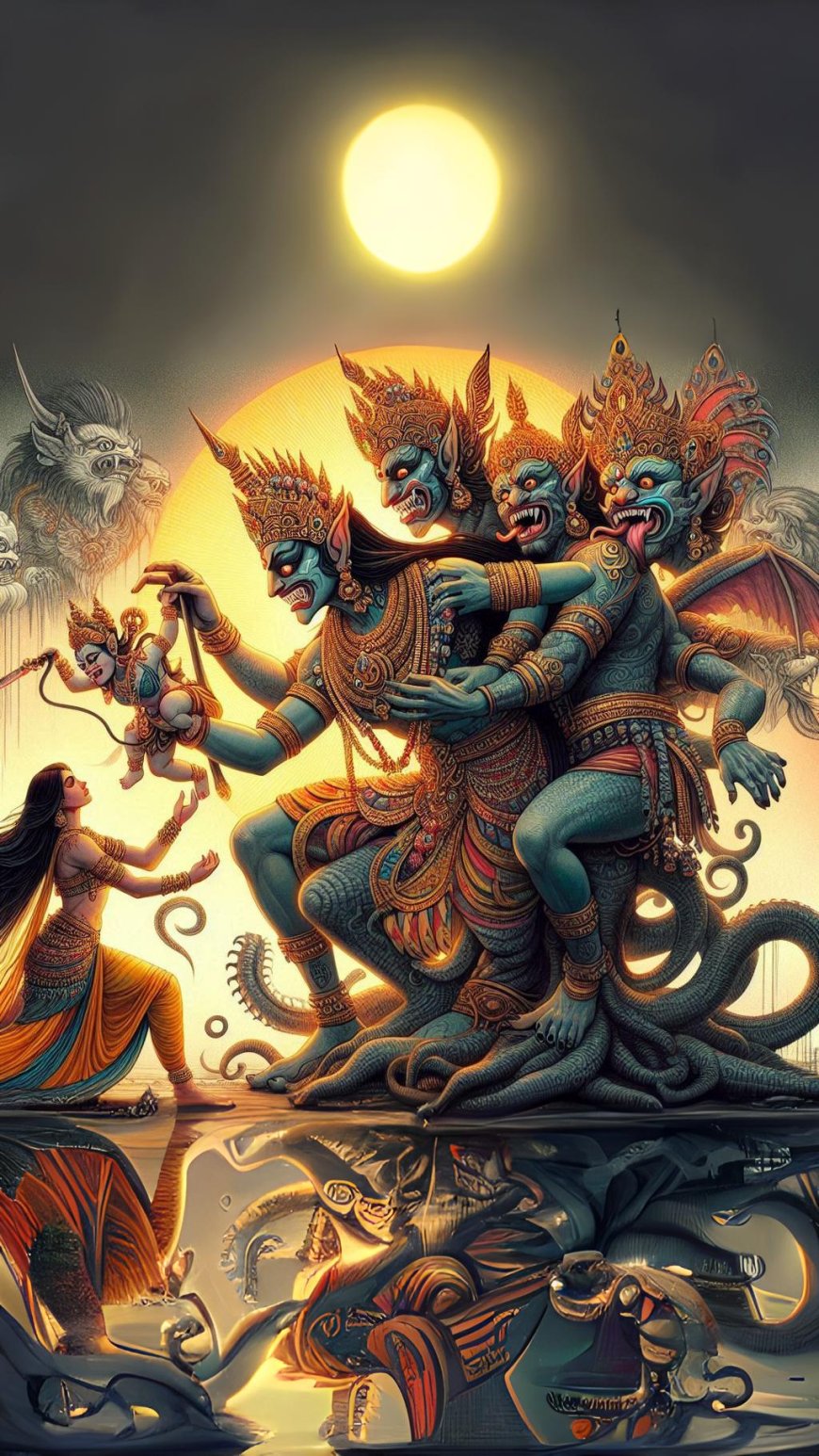 At the edge of the forest, atop the mist-covered Mount Kailasa, lived a giant king named Rahwana. Known for his tremendous strength and unbounded greed, Rahwana had long sought a way to gain even greater power, and he believed that Sinta’s beauty held the key to fulfilling his ambitions.