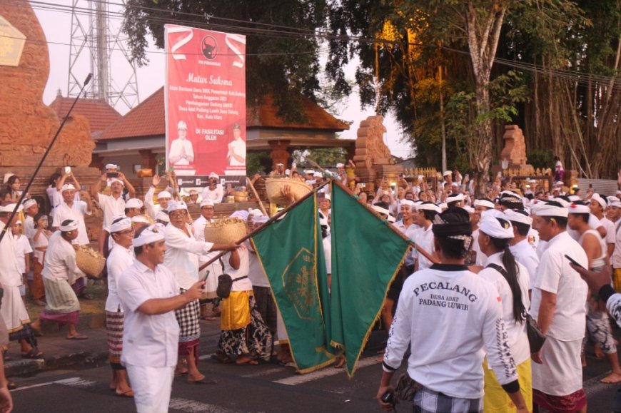 To this day, the procession begins with communal prayers at Pura Desa lan Puseh. Each household brings offerings consisting of six tipat and six bantal. The villagers are then divided into two large groups based on their banjar (hamlet) locations: north and south. This tradition involves six traditional banjar: Tegal Jaya, Celuk, Jeroan, Pendem, Gaji, and Kwanji.