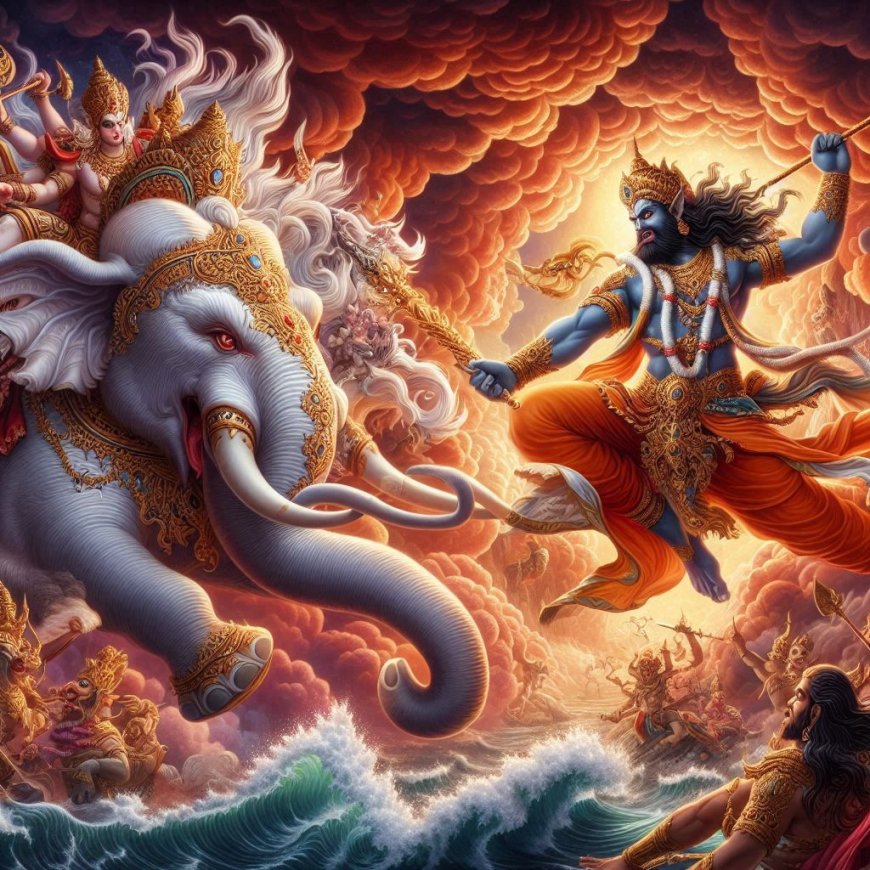Ilustrasi Pertarungan Bhairava dengan Dewa Indra (Sumber : Koleksi Pribadi)