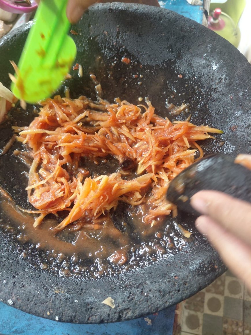 Cara Membuat: Pepaya muda dikupas, lalu diserut tipis memanjang (digobed). Ulek semua bumbu halus di cobek, tambahkan air secukupnya. Masukkan pepaya serut, lalu aduk rata. Sajikan segera.