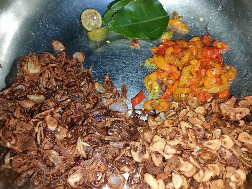 - Jeruk limau dan daun jeruk: Tambahkan di akhir untuk memberikan aroma segar dan rasa asam yang menyeimbangkan kekayaan rasa sambal.