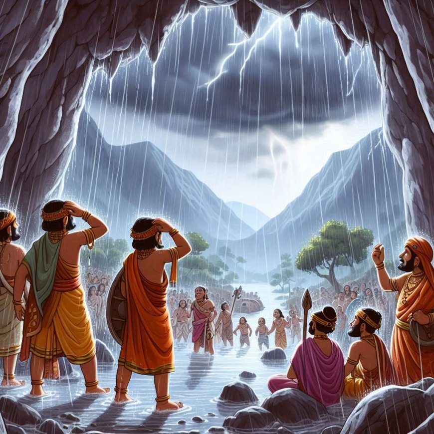 Those who had been running around frantically filled with fear, now gathered under the hill, feeling sheltered from the fierce rainstorm and the threatening winds. Under Govardhana Hill, the villagers found calm and security. The calm that the people of Vrindavan felt in the midst of this violent storm was due to the blessings of Krishna's courage and wisdom.