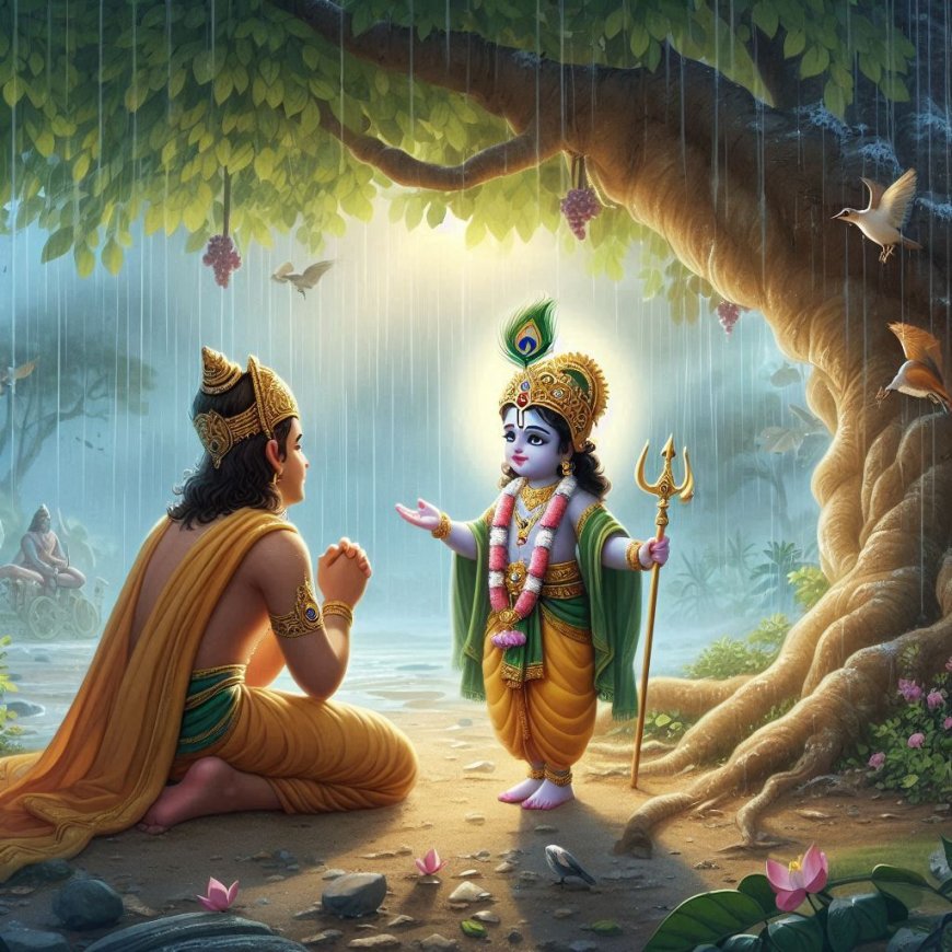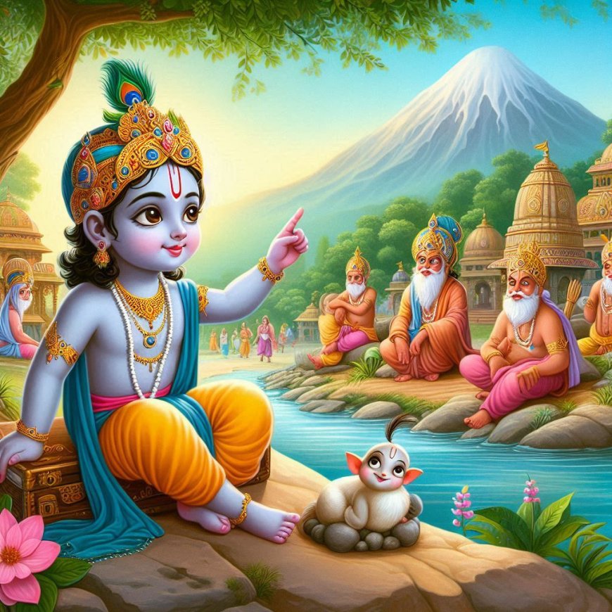 Little Krishna came to his father, Nanda Maharaj. With great curiosity, Krishna asked why this ceremony had to be performed. Nanda Maharaj thought for a moment, looked at his son's inquisitive face, then began to explain gently. He explained that this ceremony was essential to invoke the favor of Lord Indra, the lord of rain, as well as an expression of gratitude for the blessings of fertility that had been bestowed upon the people of Vrindavan.