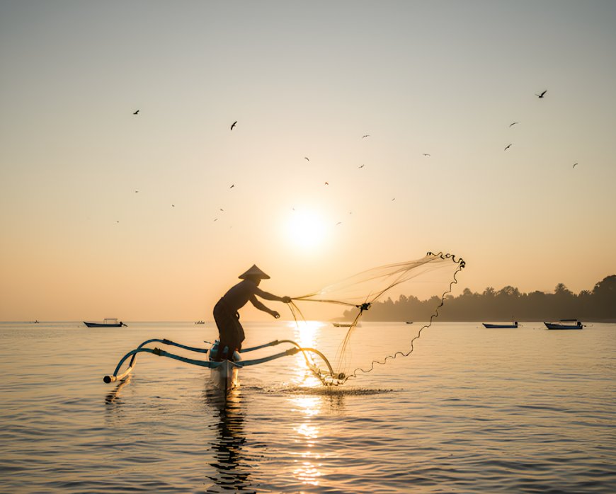 A fisherman casting a net at sunrise, AI illustration (Source: Private Collection)