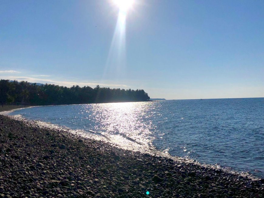 Palisan Beach displays a distinctive landscape with a shoreline dominated by natural stones. These stones vary in shape and size and are arranged naturally along the coast without artificial intervention. When the sun is high, the color of the stones becomes more striking, producing light reflections that contrast with the distant ocean. This scene imparts a natural and calm impression, different from sandy beaches that are commonly frequented by tourists.