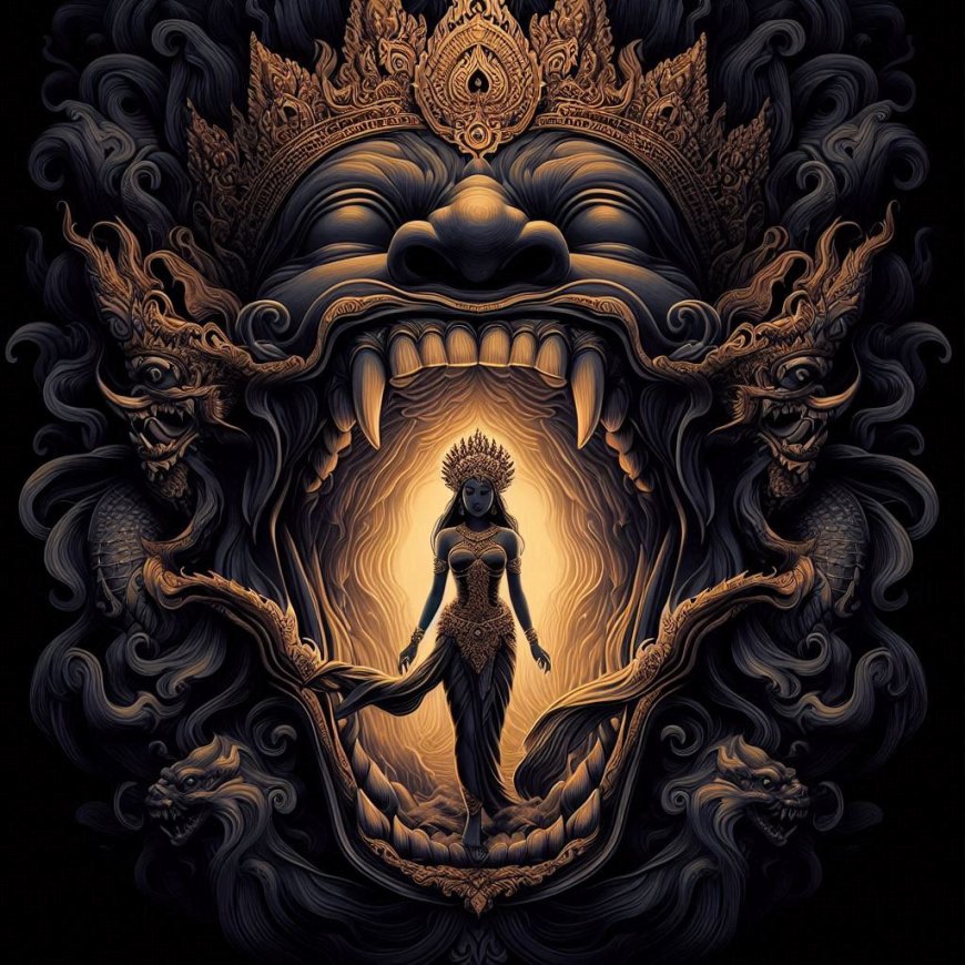 Hearing Kala Rau's words, Dewi Ratih trembled in fear. She felt powerless and unable to escape as Kala Rau's head moved closer, embracing her. As Kala Rau's head drew nearer, Dewi Ratih felt a strong pressure, as if her entire body was being compelled to come closer. Slowly, her graceful and beautiful body began to be swallowed by Kala Rau. With each passing second, Dewi Ratih felt herself being consumed by the terrifying force of Kala Rau, until eventually, her entire existence was engulfed by the monstrous figure.