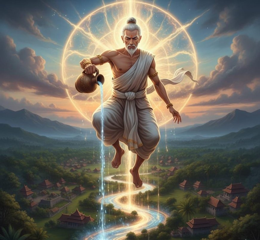 AI Illustration of Mpu Bharadah Pouring Water from an Earthen Jar to Create a Territorial Boundary (Photo Source: Personal Collection)
